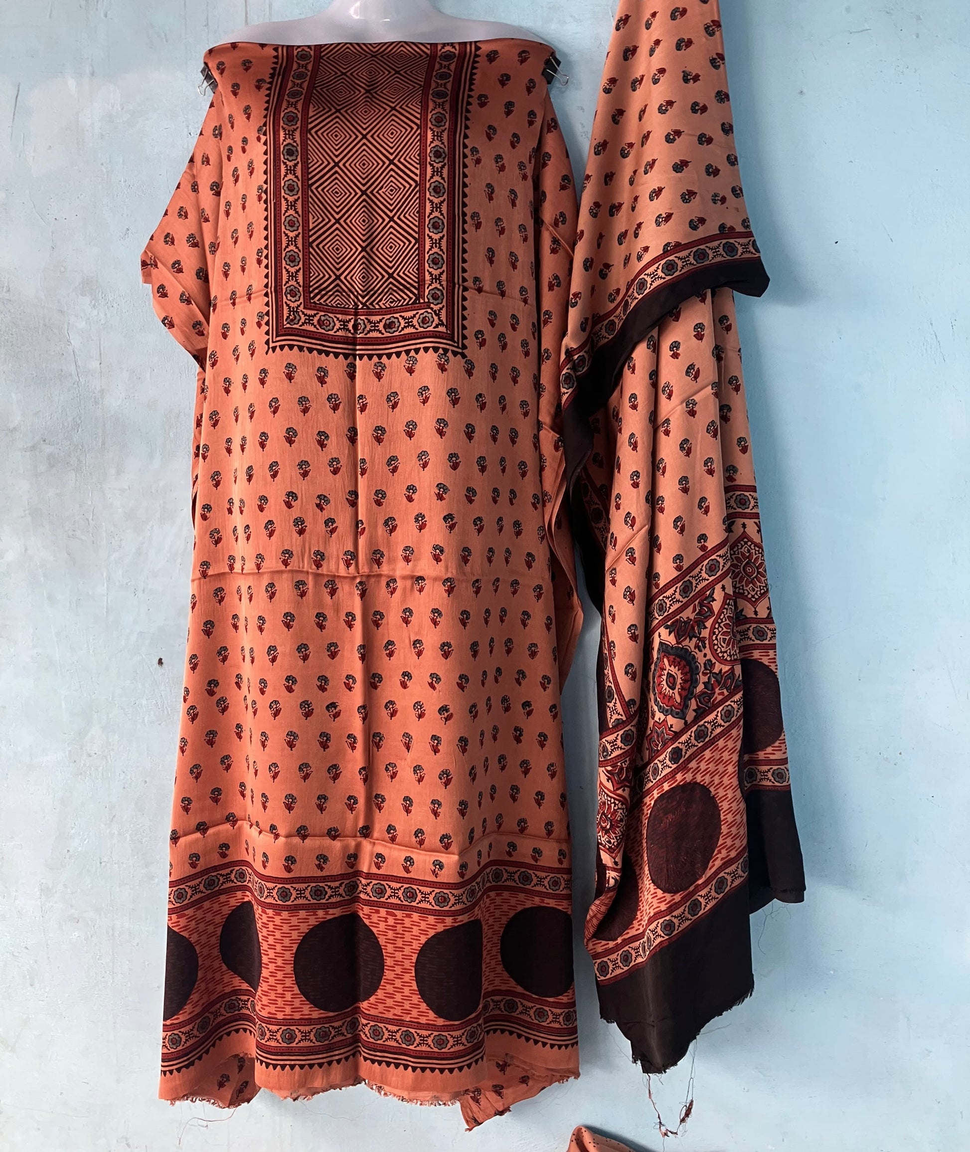 Discover the ancient art of Ajrakh brought to life by master craftsmen from Ajrakhpur, Gujarat - where this 4,000-year-old tradition has been preserved through generations. Each intricate pattern on this premium modal silk suit set tells the story of skilled artisans who have dedicated their lives to perfecting this timeless craft.