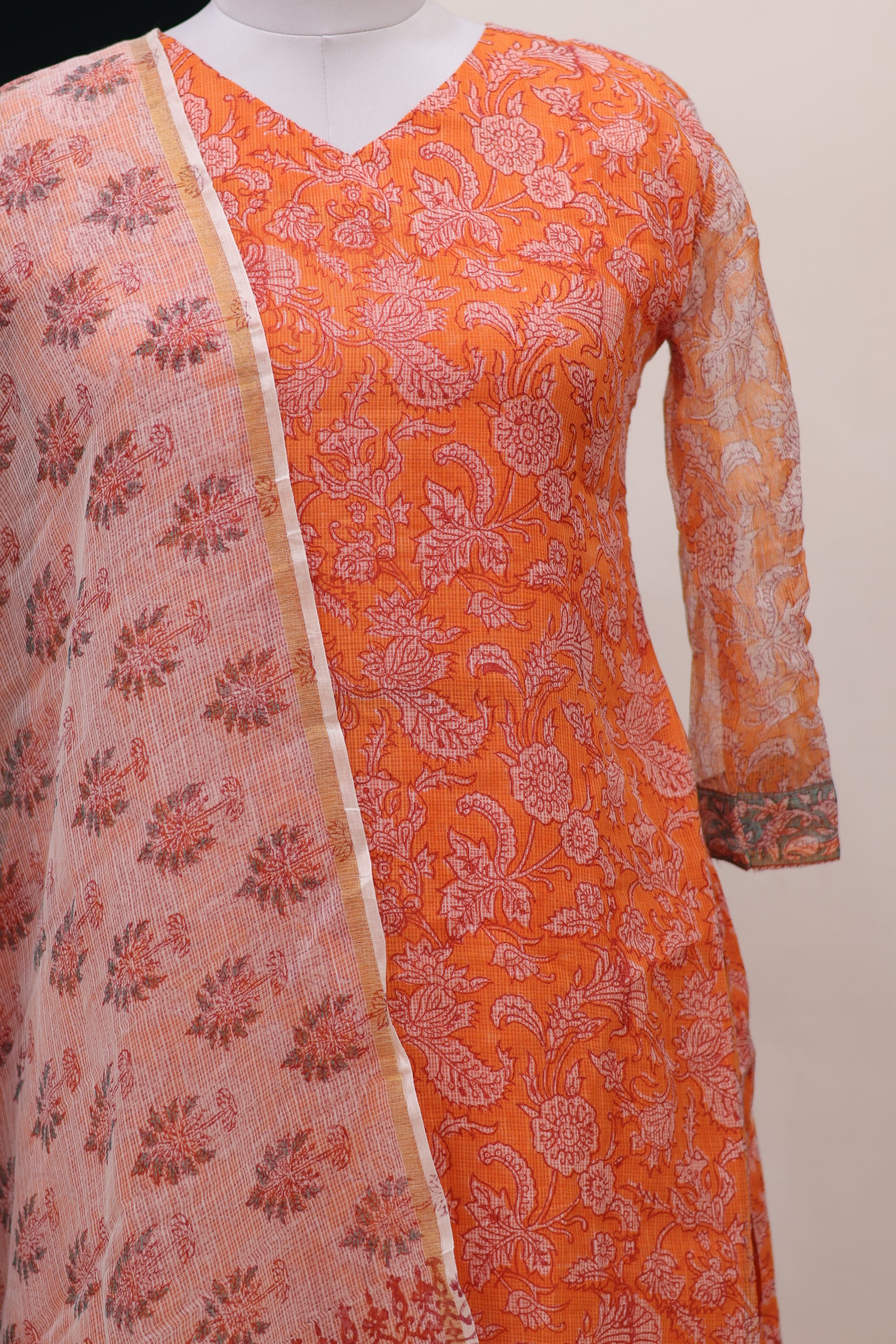 ORANGE HANDBLOCK PRINTED KOTA 3-PIECE SUIT (STITCHED)