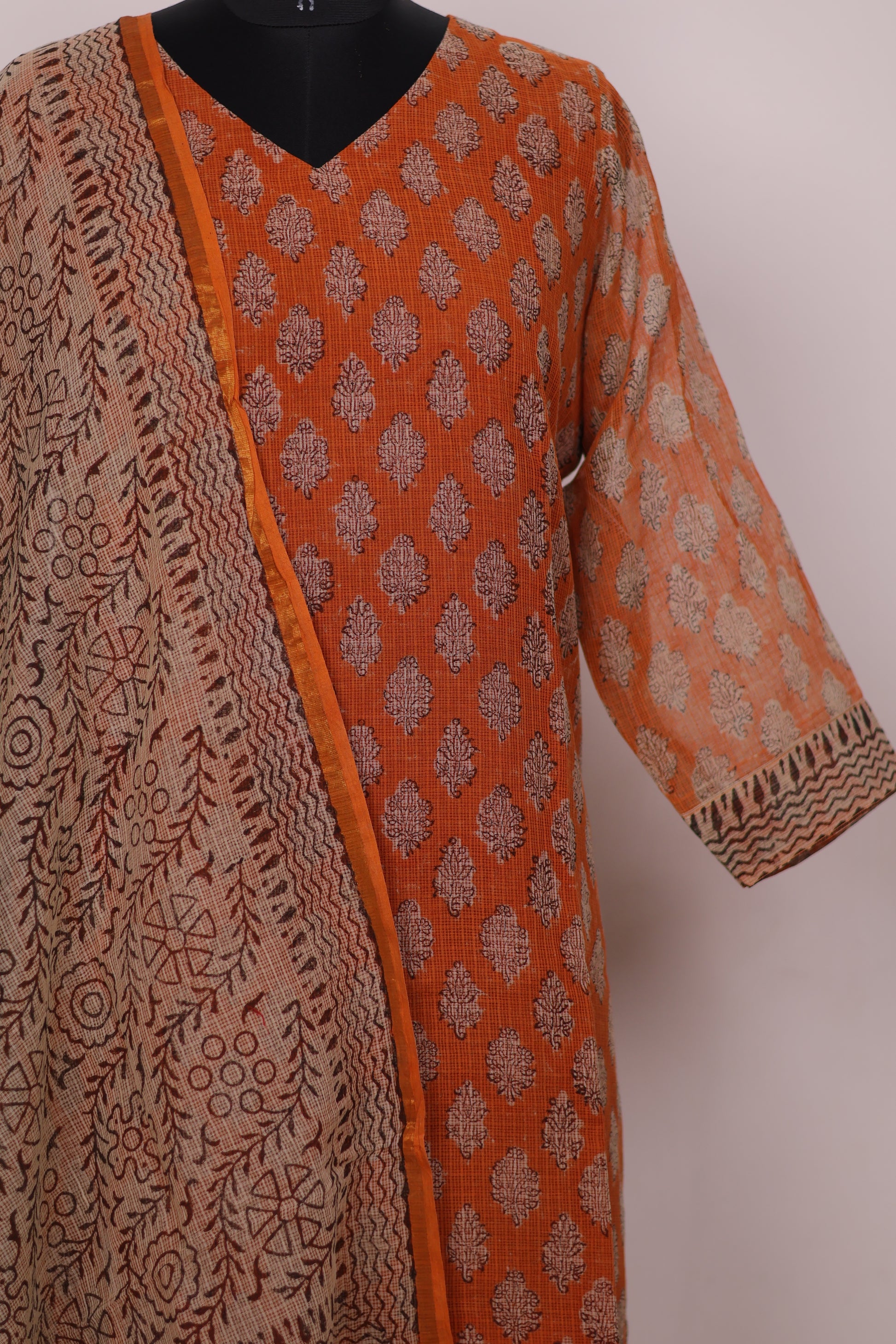 ORANGE HANDBLOCK PRINTED KOTA 3-PIECE SUIT (STITCHED)