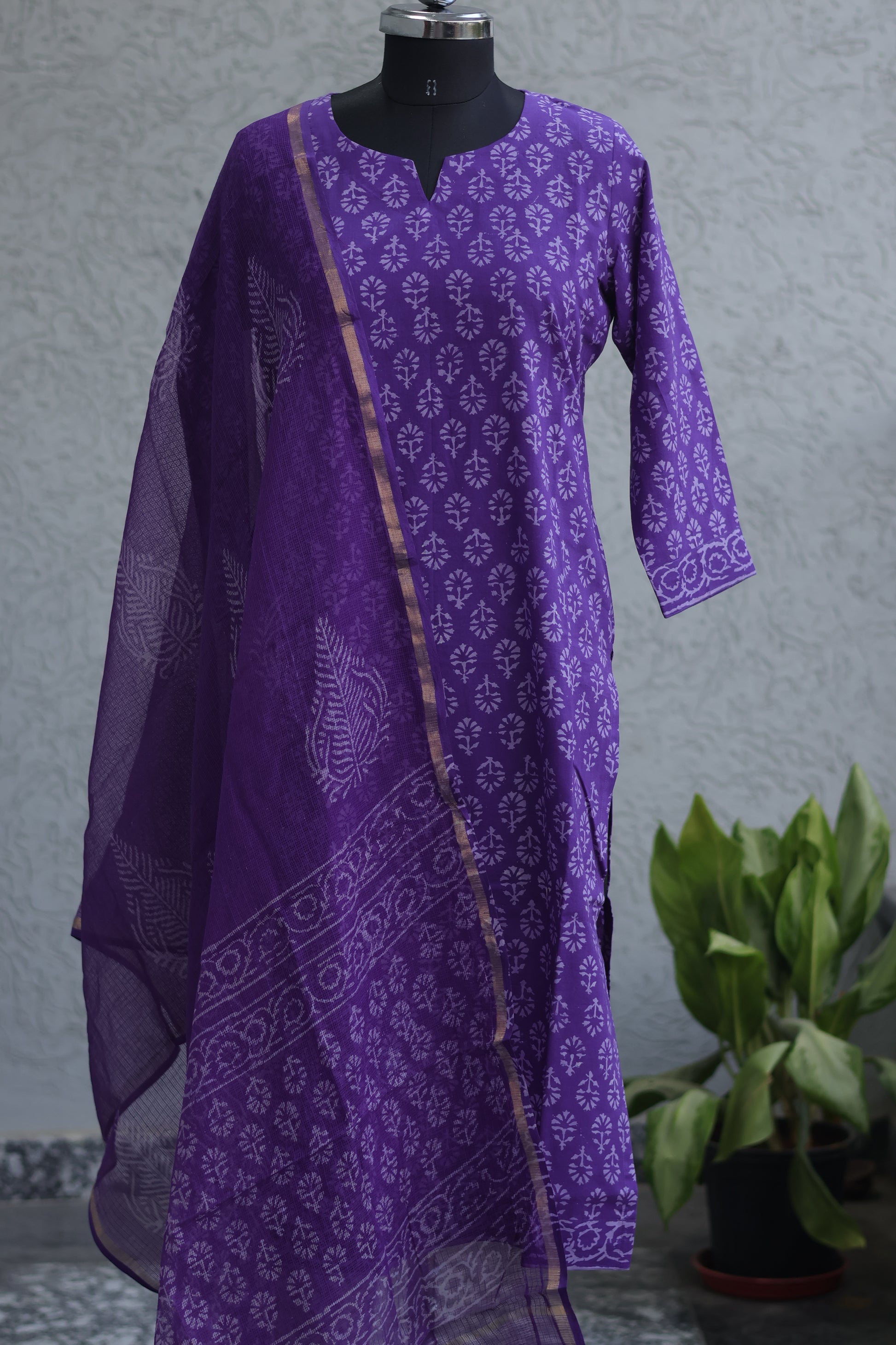 Violet Handblock printed Pure Mul Cotton with Kota Doria Duppata 3 piece suit (stitched)