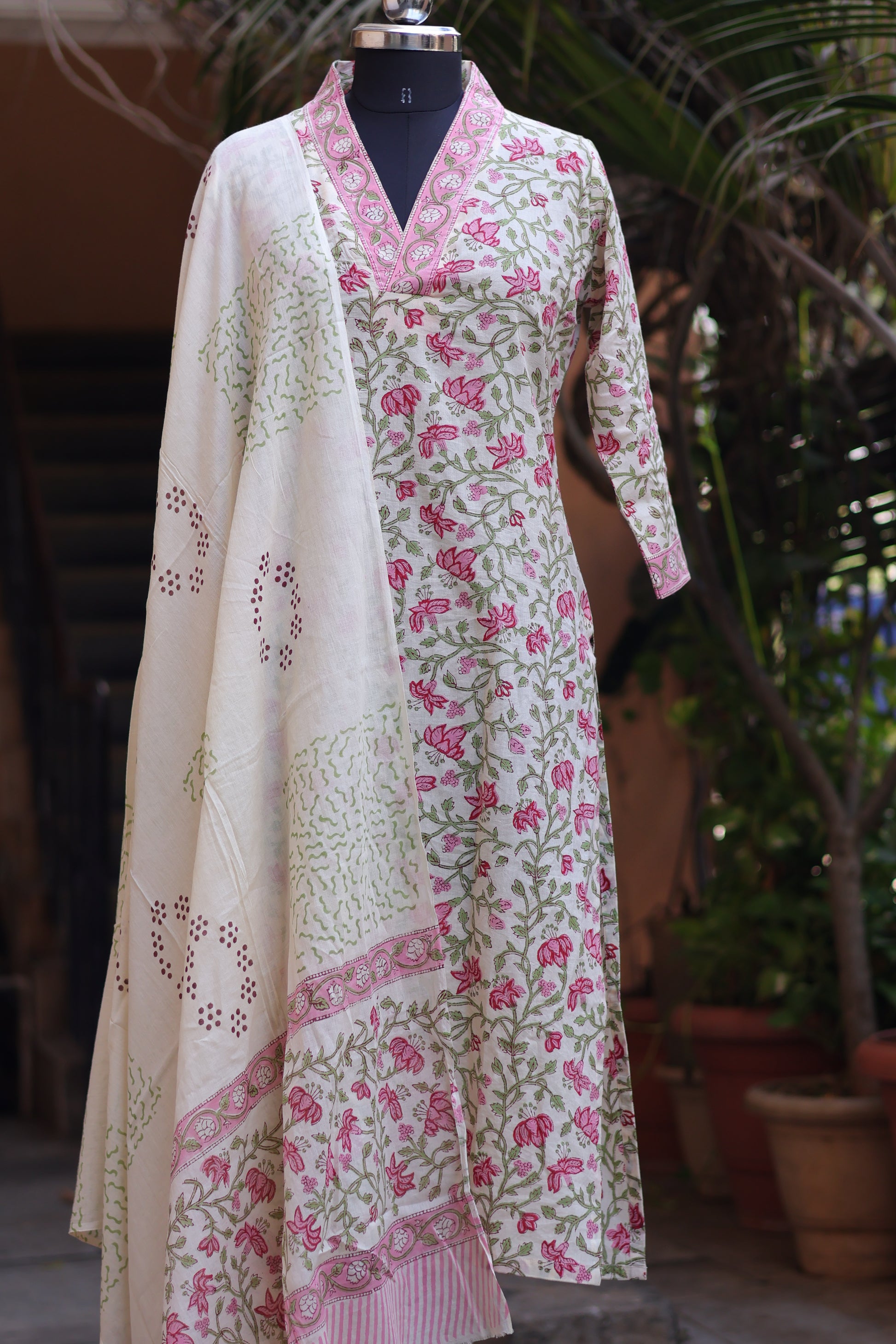 Handblock printed Pure Mul Cotton with Mul Cotton Duppata 3 piece suit (stitched)