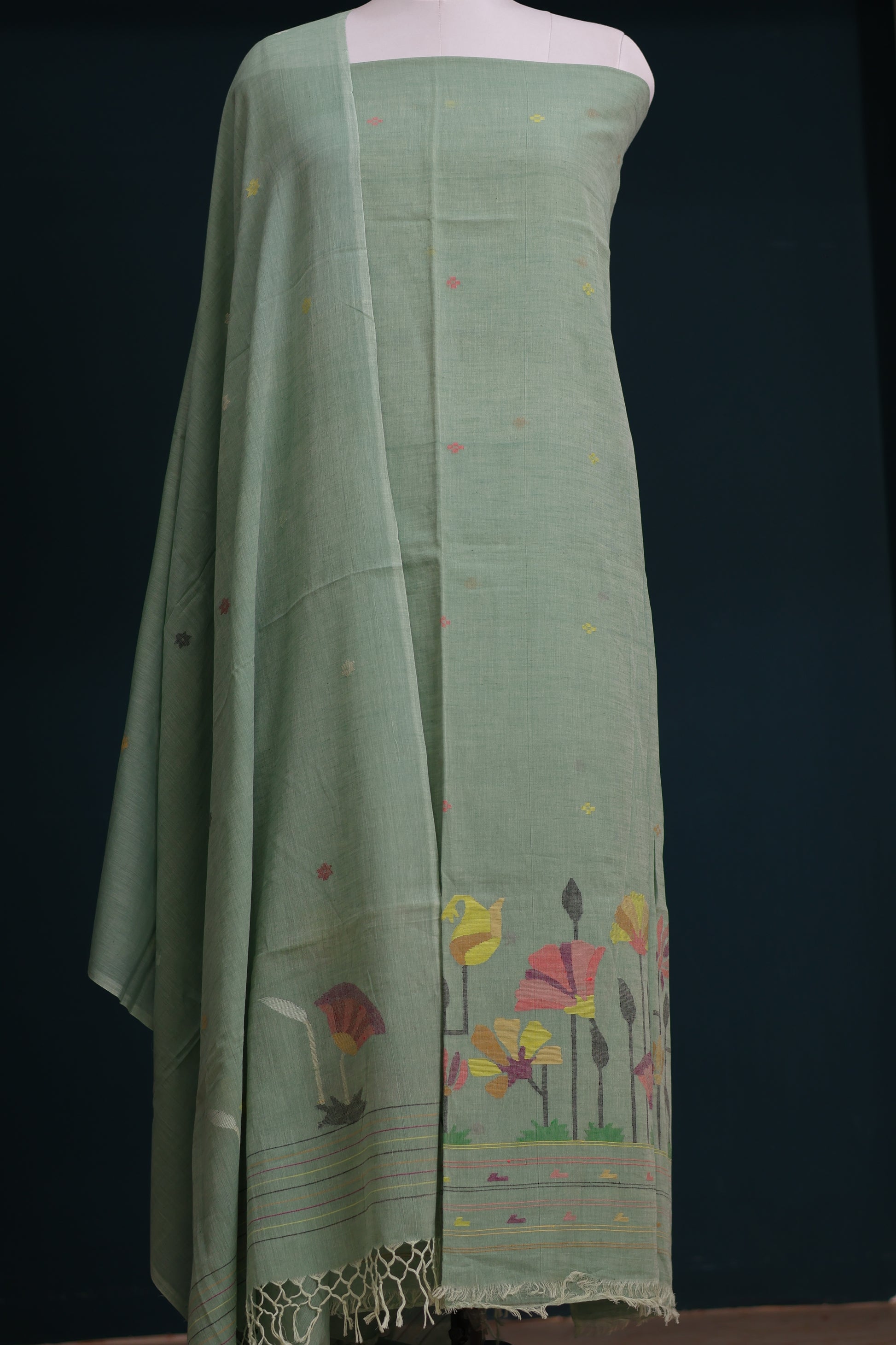 Experience the charm of tradition with our handwoven Jamdhani pure Malai cotton 2-piece suit set. This elegant set includes a 2.5-meter top fabric and a 2.5-meter dupatta, crafted from soft, breathable Malai cotton and woven by skilled artisans using age-old Jamdhani techniques.