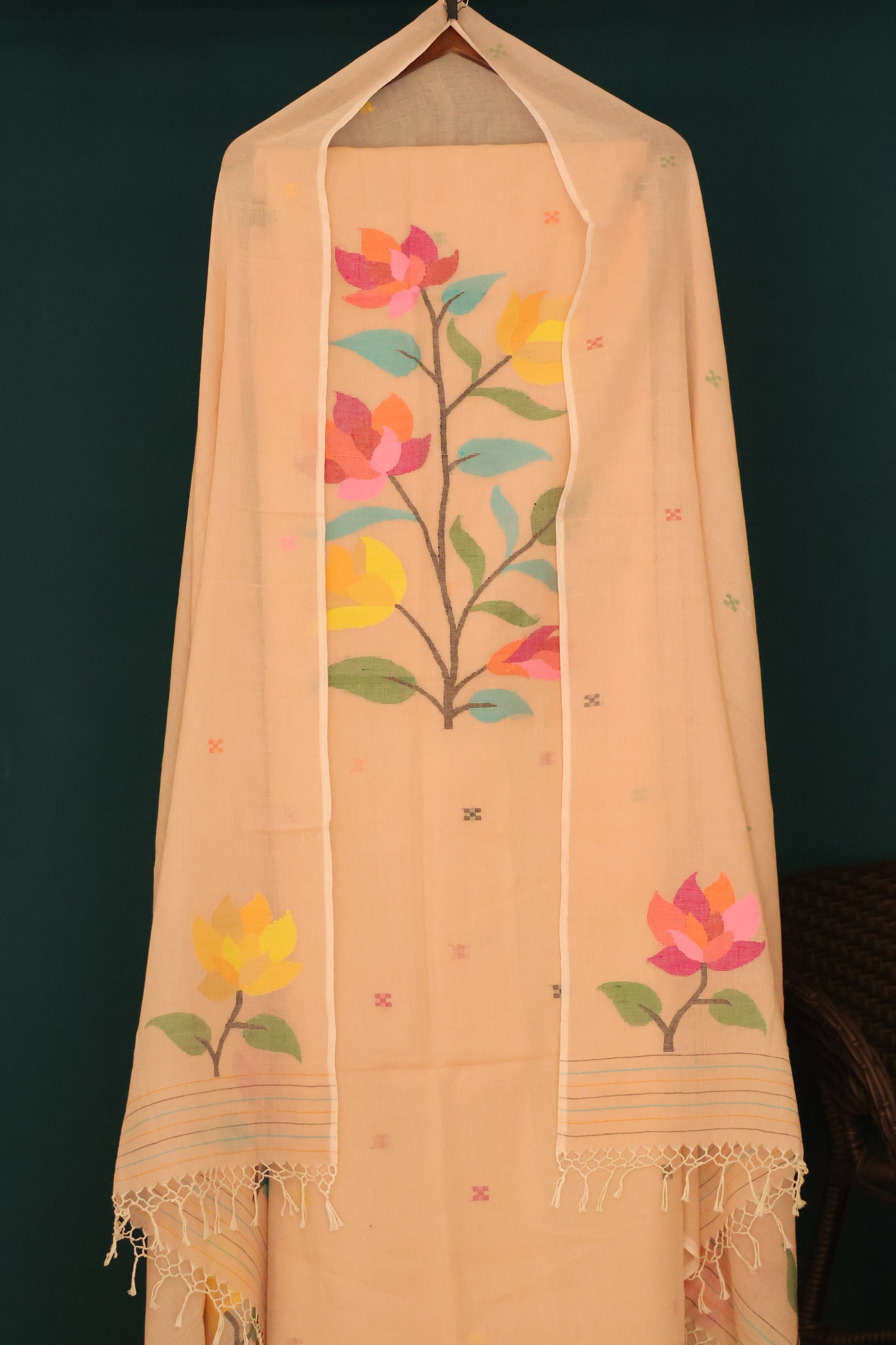 Every piece reflects the beauty of handmade craftsmanship, with minor irregularities in the weave or color that add character and authenticity. The soft floral motifs and subtle texture create a graceful look that suits both everyday wear and special occasions.