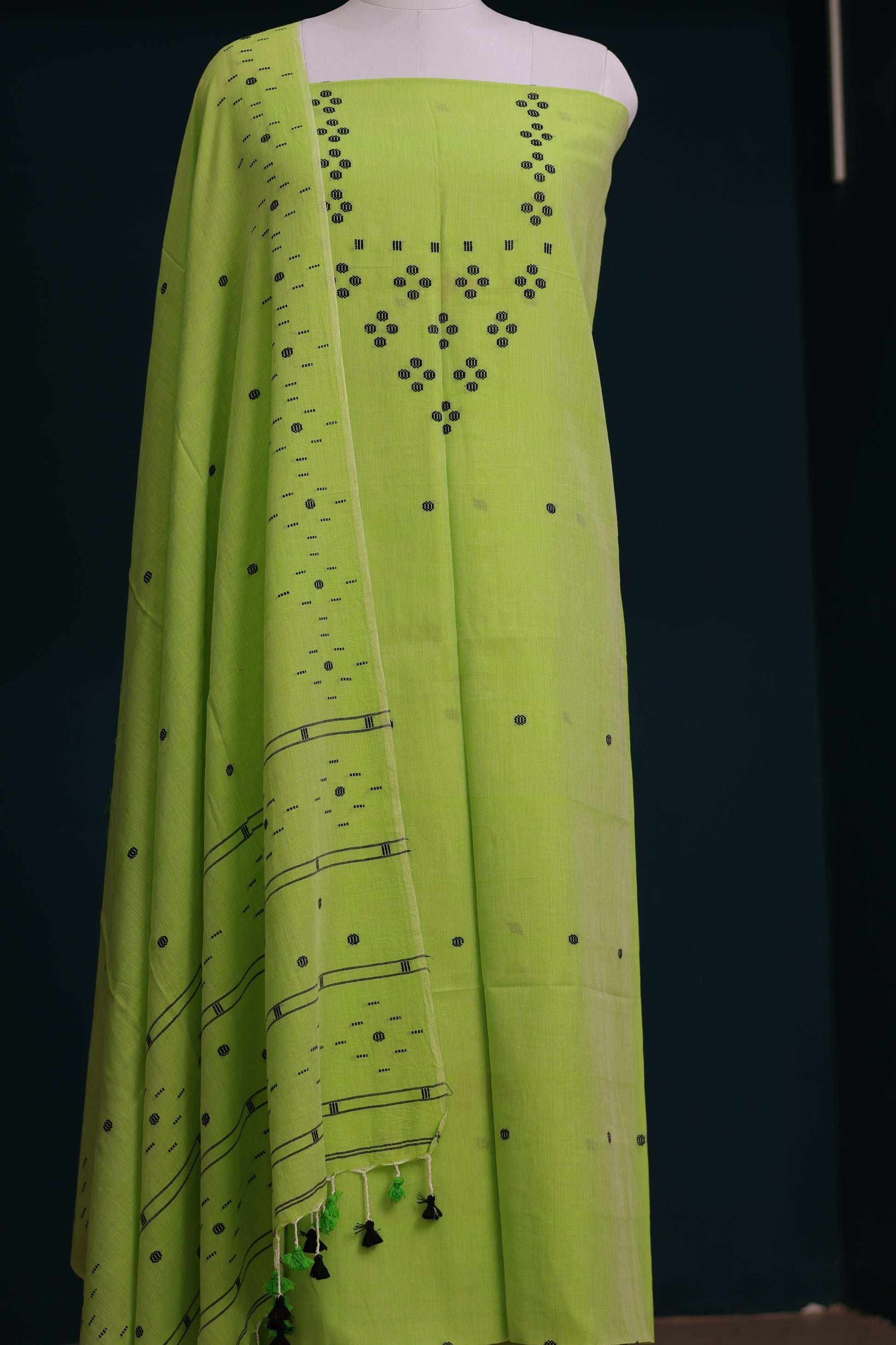 Experience the charm of tradition with our handwoven Jamdhani pure Malai cotton 2-piece suit set. This elegant set includes a 2.5-meter top fabric and a 2.5-meter dupatta, crafted from soft, breathable Malai cotton and woven by skilled artisans using age-old Jamdhani techniques.