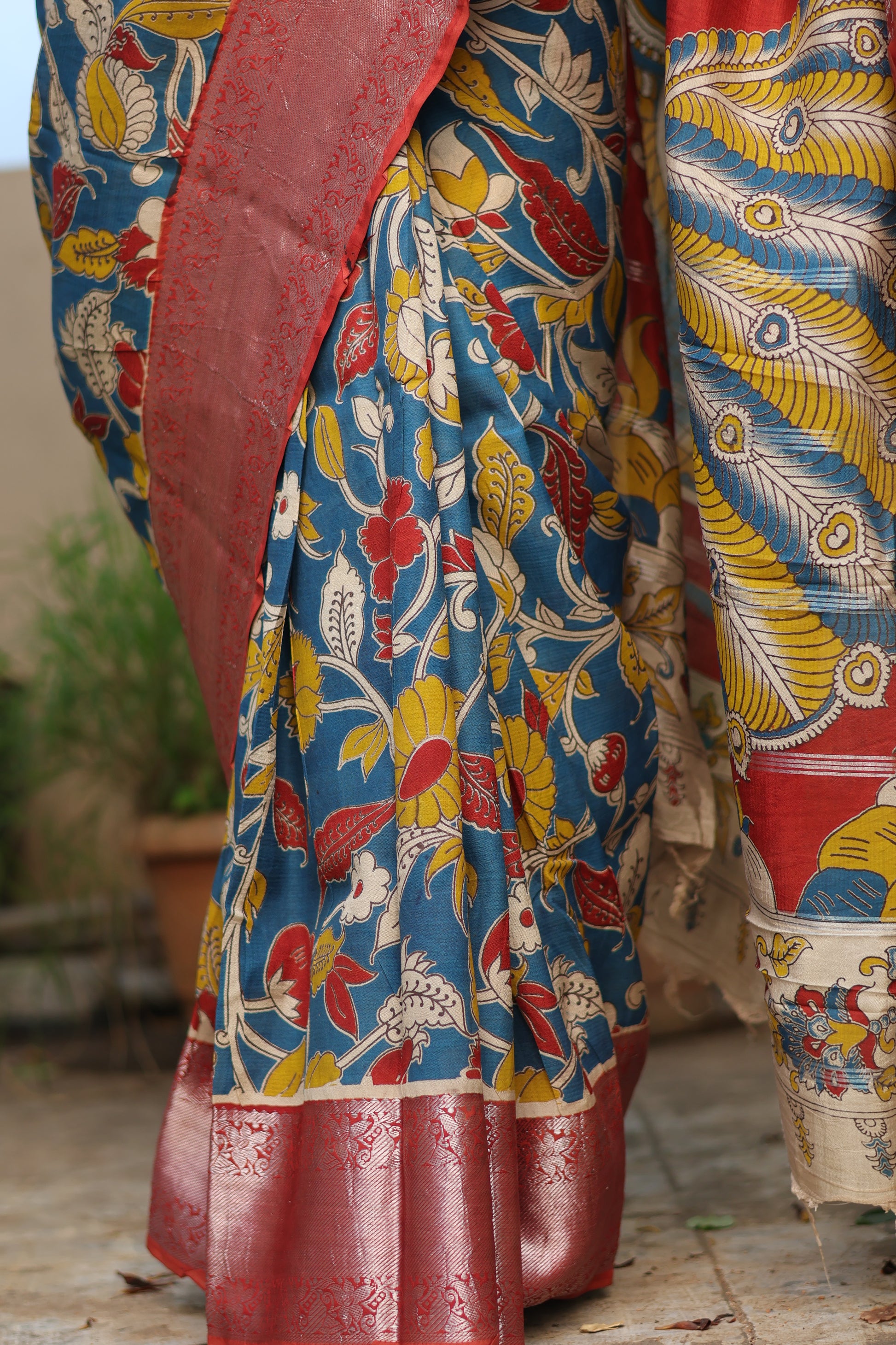 Blue Floral Kalamkari Silk Handcrafted Kanchi Border Saree