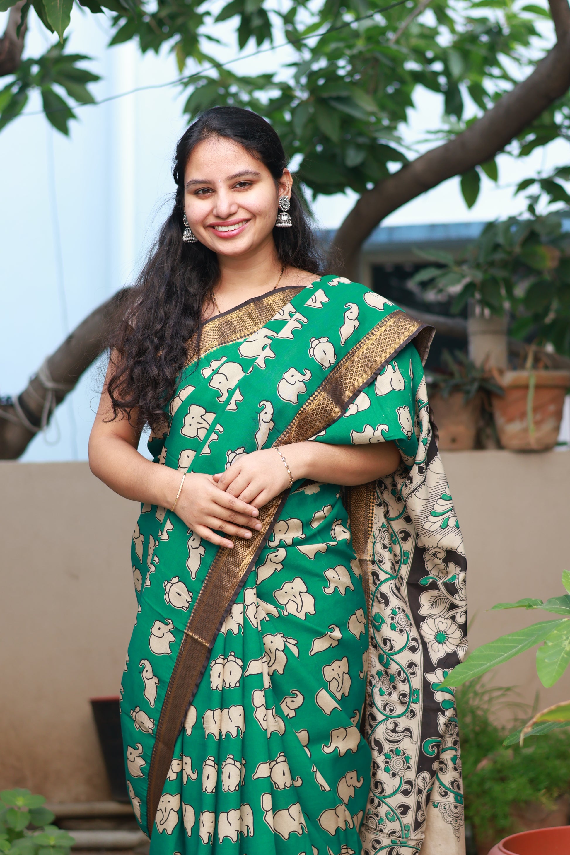 Green & Cream Elephant Kalamkari Silk Handcrafted Nizam Border Saree