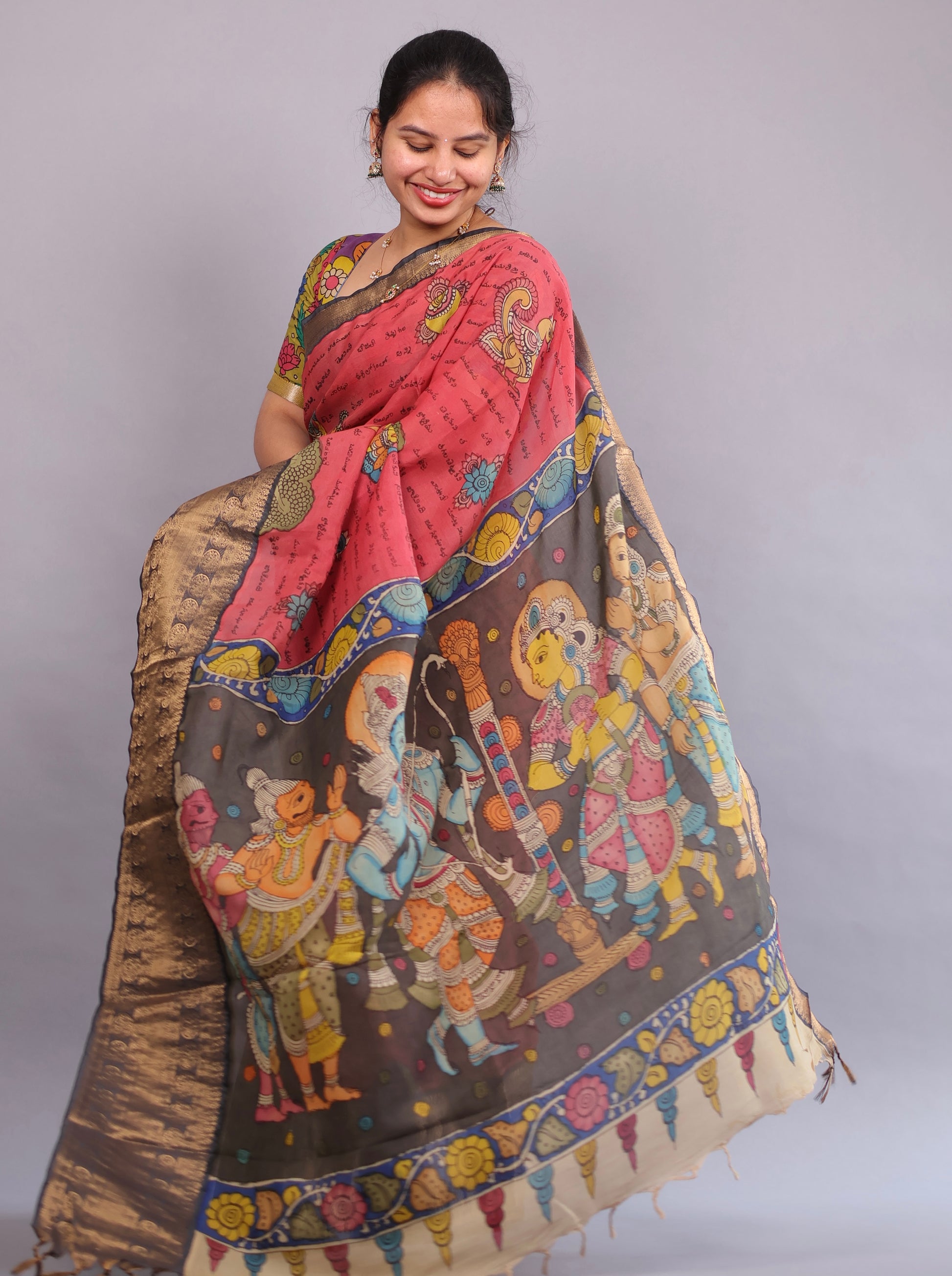 Our products are handcrafted, so slight variations in colour, shade, motifs, and texture are natural and enhance their unique character. These variations are a hallmark of authentic hand-drawn Pen Kalamkari sarees.