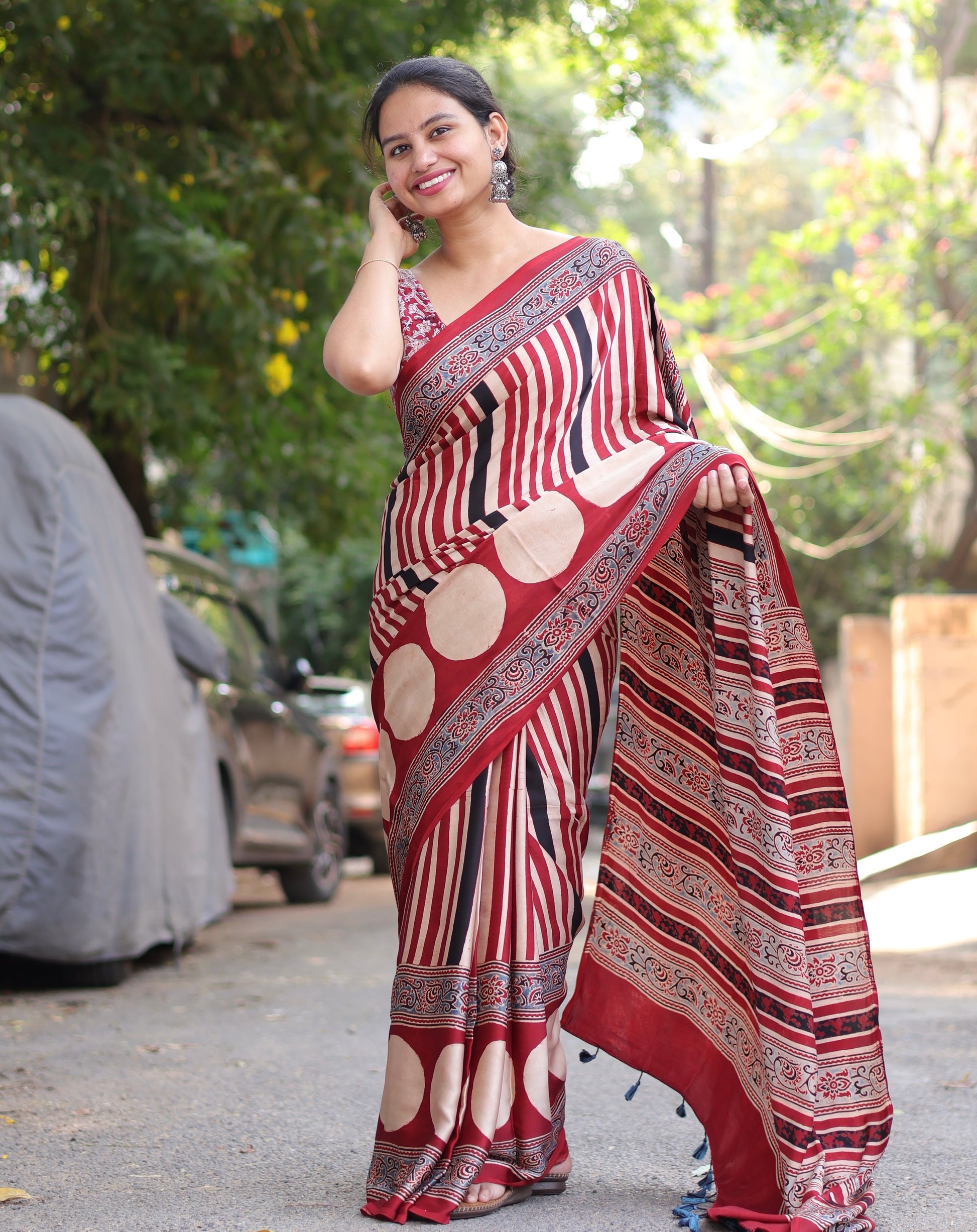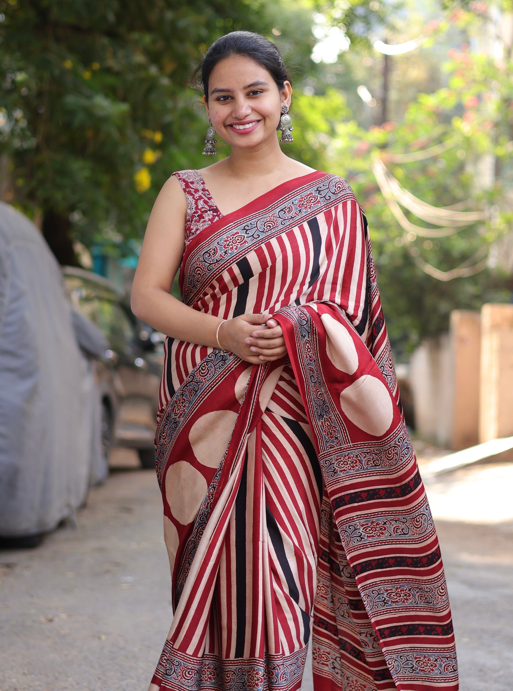 Heritage Craftsmanship: This ajrakh saree represents the best of Indian block printed artistry, where each piece goes through the traditional 16-step process using natural dyes and hand-carved wooden blocks. The modal silk fabric combines the beautiful shine of silk with better breathability, making it perfect for long wear during celebrations.