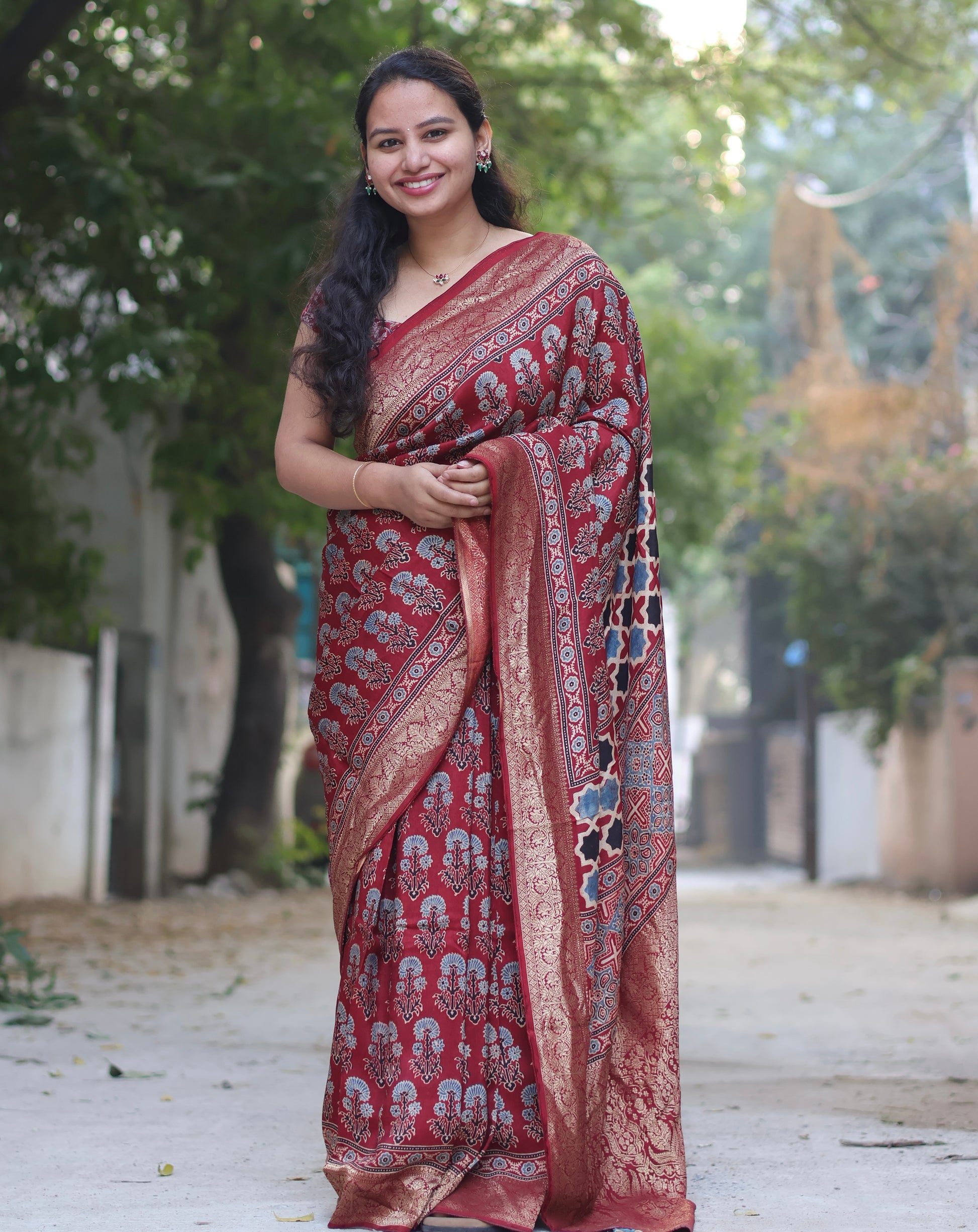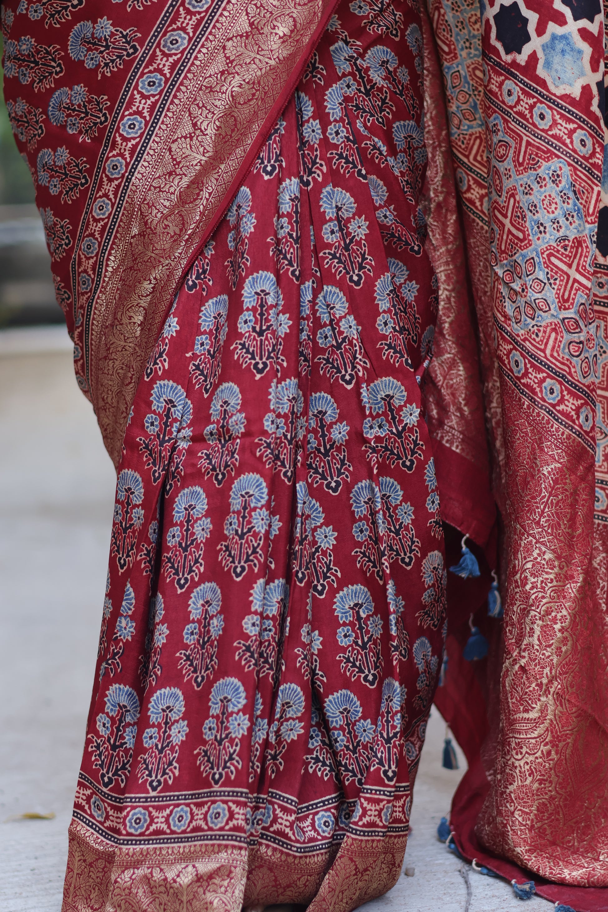 Traditional Ajrakh Handblock Printed Dola Silk Saree