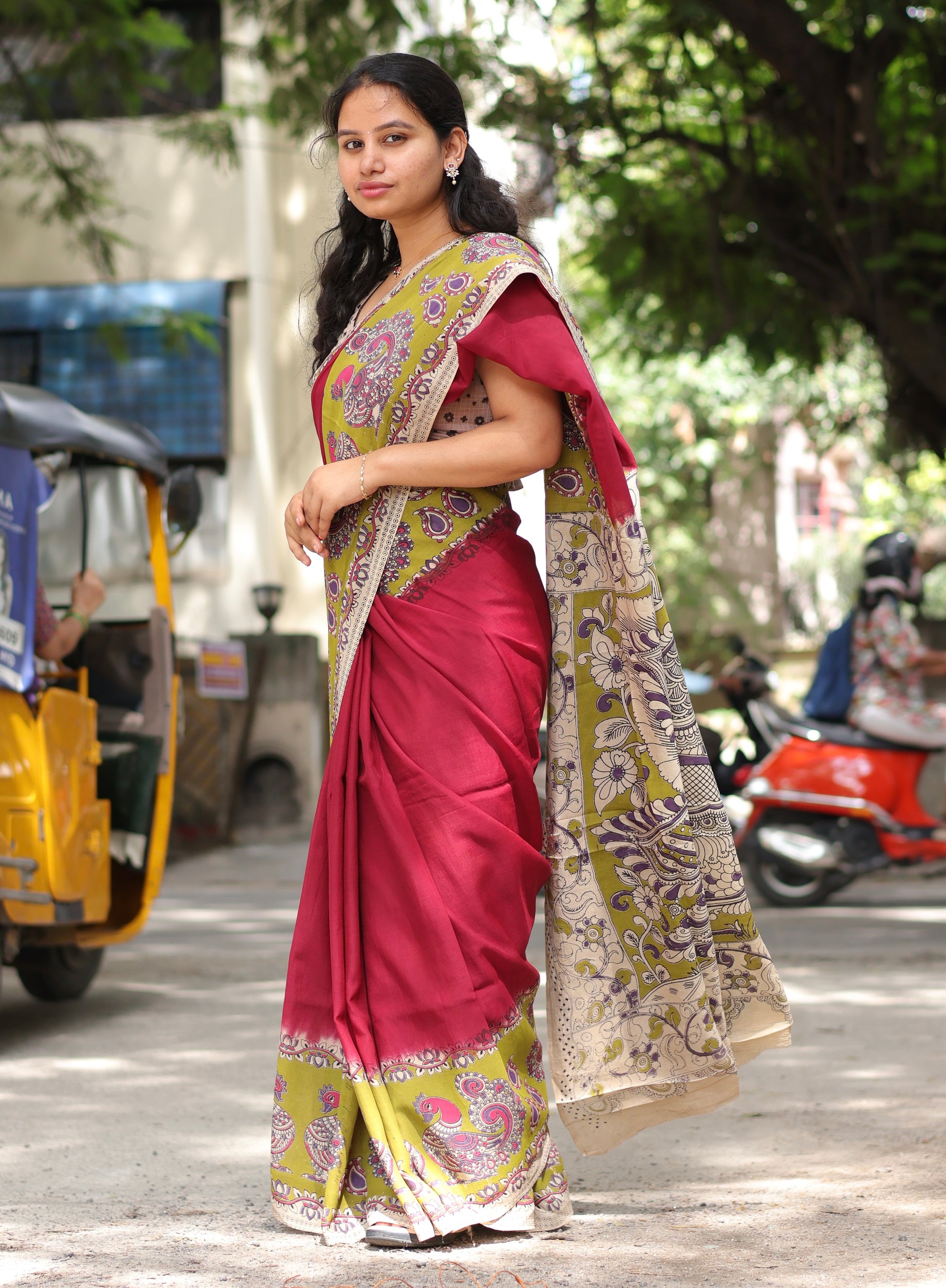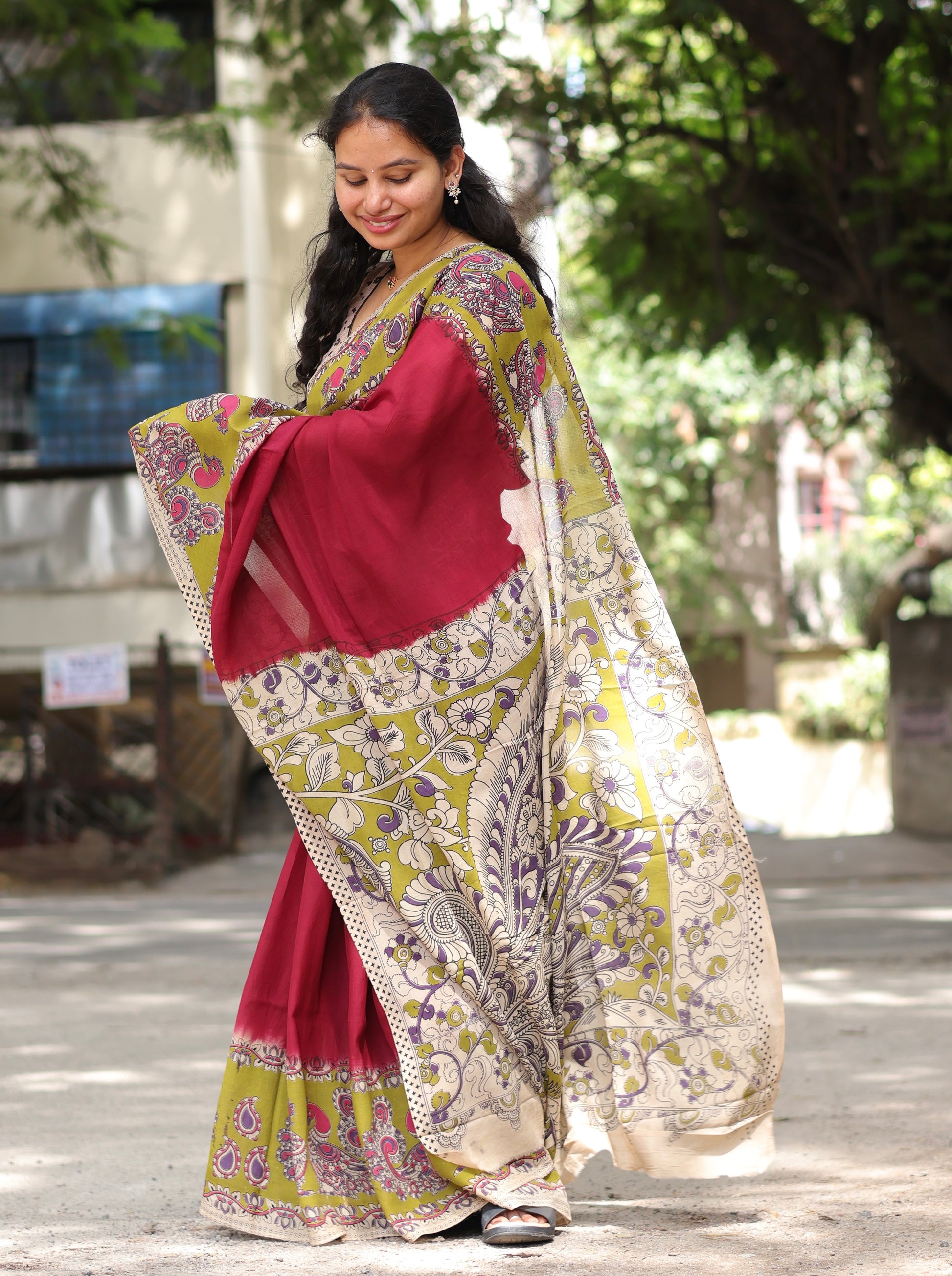 Wine & Green Kalamkari dyeing premium chennur silk saree