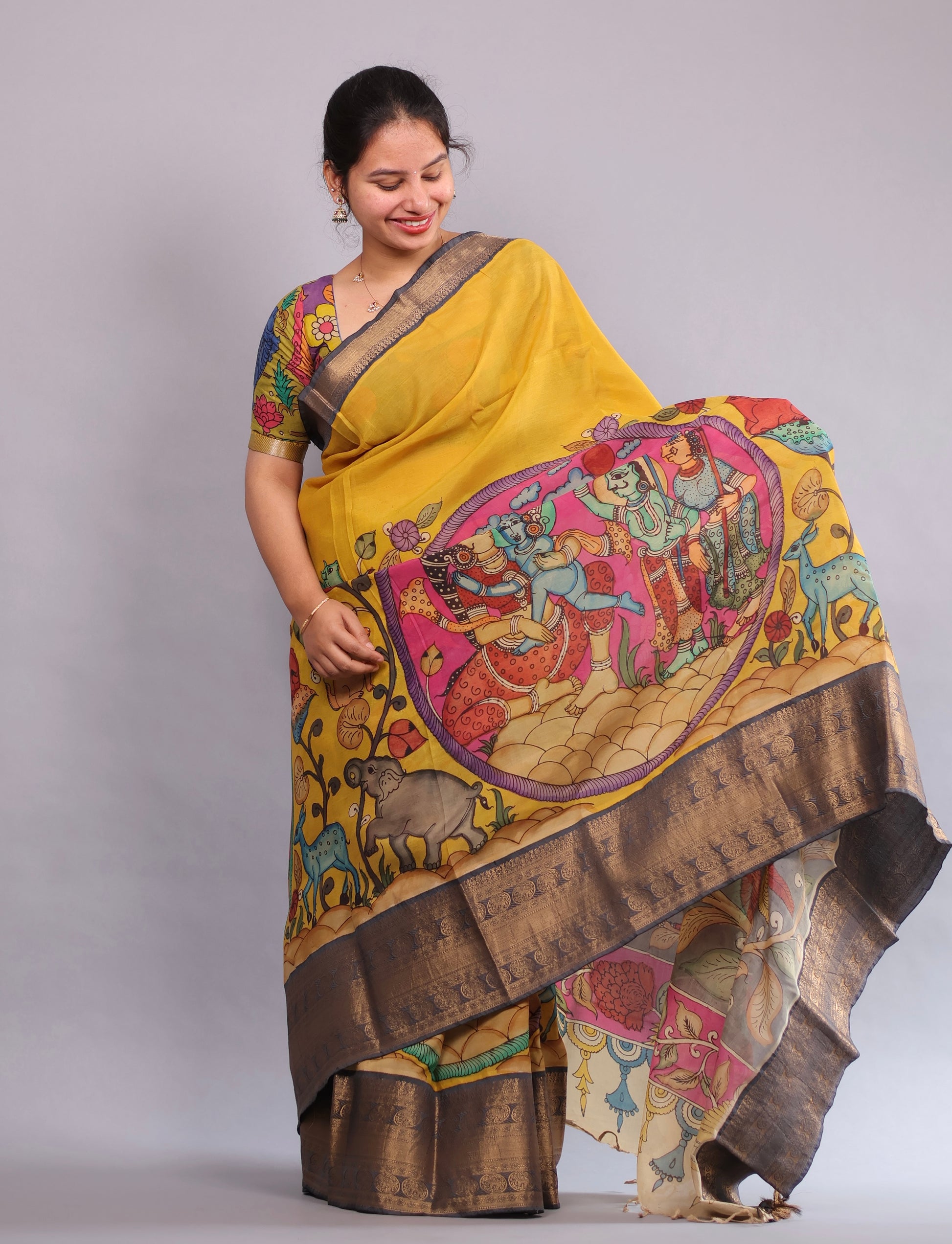 Our products are handcrafted, so slight variations in colour, shade, motifs, and texture are natural and enhance their unique character. These variations are a hallmark of authentic hand-drawn Pen Kalamkari sarees.